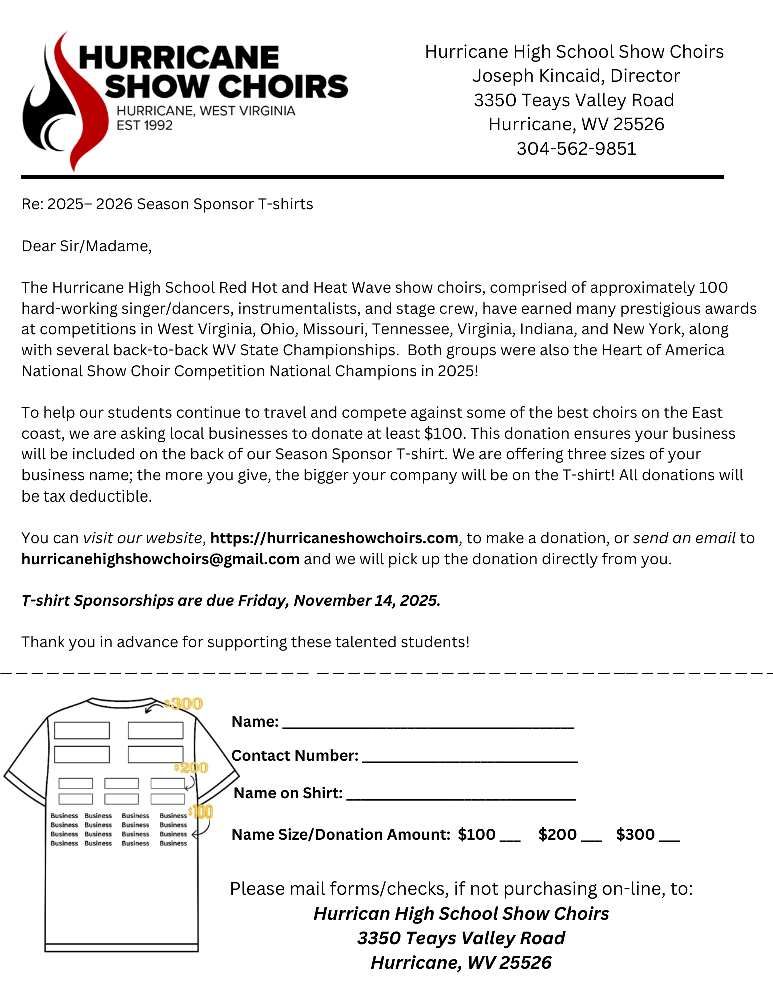To help send our students to this national competition, we are asking local businesses to donate at least $100. This donation ensures your business will be included on the back of our Season Sponsor T-shirt. We are offering three sizes of your business name; the more you give, the bigger your company will be on the T-shirt! All donations will be tax deductible. Click the link below to make an online donation, or send an email to hurricanehighshowchoirs@gmail.com and we will pick up the donation directly from you.